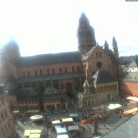 The camera shows the market square of the city of Mainz and the Cathedral of St....
